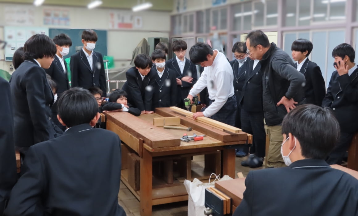 一宮市立浅井中学校での「職業人と語る会」に講師として参加し、建築業界の職種や必要な資格、進路等をお話しました。また、大工さんの実演や体験学習を実施しました。多くの質問もいただき、生徒たちの積極的で前向きな姿勢に元気をもらい、地域貢献の意識を新たにしました。
